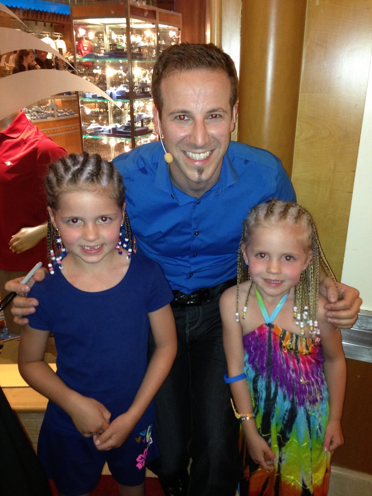 The show that night was really fun. It was a family magic show featuring Scott Pepper. He did a really amazing job at keeping planted on stage while the boat rocked. This night was pretty rocky during the show and we were very impressed at how well composed he was. I of course had to get popcorn, all three kinds. After the show, the girls got to meet Scott Pepper himself.